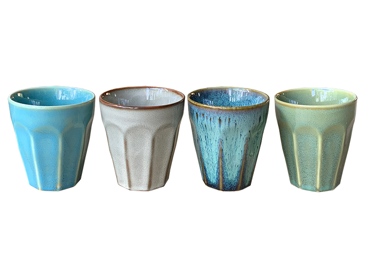 De bekers hebben natuurlijke kleuren in de tinten crème, groen en blauw. Elke set is net weer even anders en dat maakt deze robuuste bekers weer uniek!