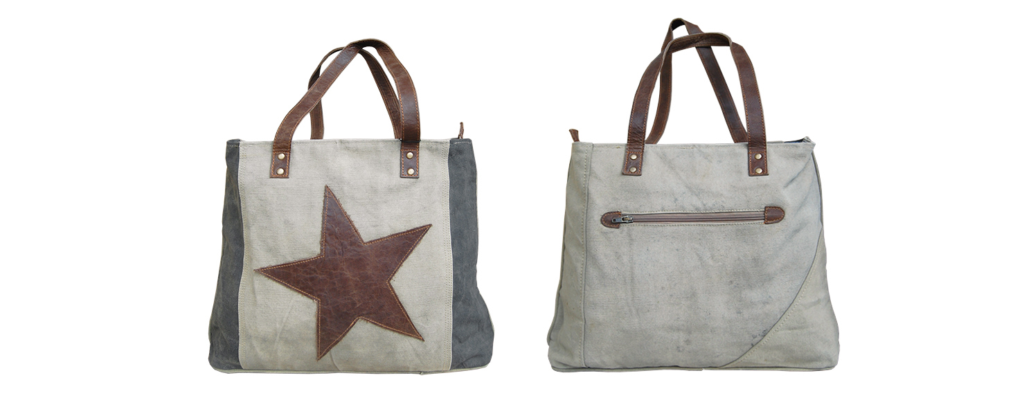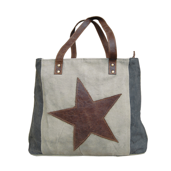 Deze stoere canvas tas loopt iets taps naar boven toe en is gemaakt van hergebruikt kaki kleurig canvas. Aan de voorzijde een baan van lichtbruin canvas met een leren ster als applicatie. De zijkanten zijn afgezet met donkergrijs canvas. Deze ruime canvas shopper met ster heeft stevige leren hengsels waarmee de tas ook over de schouder gedragen kan worden. Aan de achterzijde heeft de tas een diep, met rits afsluitbaar vak.