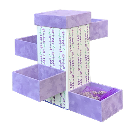 Dit is een magisch doosje. Het is ons namelijk gelukt om het ultieme vakantiegevoel in een doosje te stoppen! Bij het openen van dit magische doosje komt de geur van franse lavendel je tegemoet… heerlijk! Vakantieherinneringen komen direct bovendrijven. Dit doosje wil je op je nachtkastje hebben staan. Niet alleen voor de geur (het zakje lavendel krijg je erbij!) maar ook om gewoon jouw sieraden in op te bergen! En, als je dit doosje kado geeft aan iemand, let dan vooral op de verwondering op zijn of haar gezicht als ze ontdekken hoe dit doosje open gaat! Behalve sieraden kunnen ook kleine herinneringen in dit magische doosje worden bewaard, maar kan ook open gedraaid op tafel staan als bijvoorbeeld theedoos.